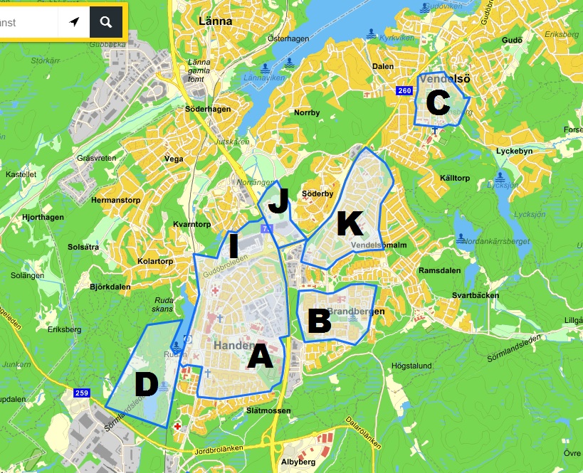 Förbudsområde K: Vendelsömalmsvägen – Tyrestavägen – Klarabergsvägen.